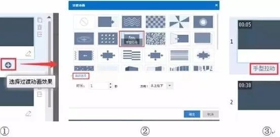 2、场景切换:点击场景页面下方的加号选择合适的过渡动画,并可对其进行“高级选项”的设置,如调整转场持续时间、进入方向等;点击 “确定”后,该场景页面下方就会出现过渡动画名称