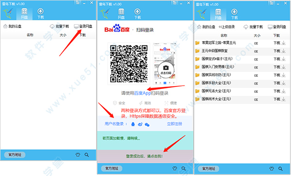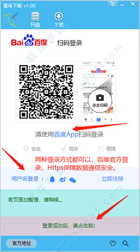 1、运行软件后,首先需要登录百度账号。在网盘页面点击网盘登录按钮。登录是基于百度官方入口,受官方Https协议保护,安全可靠。