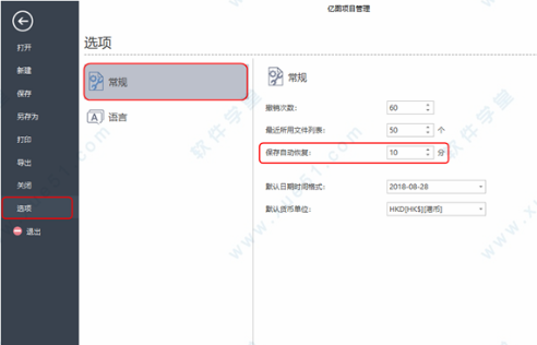 4、在【选项】–【常规】中,你可以根据自己的需求设置Edraw Project项目管理软件的自动备份时间间隔。