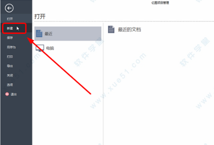 1、当电脑恢复正常,重新打开软件后,点击【新建】创建一个空白的绘图项目,或随意打开一个项目文件。