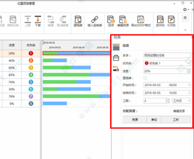 3、设置任务信息:点击右侧的“任务”面板,在该对话框中设置任务的基本信息,包括任务的名称、开始时间、结束时间、优先级、项目工期等等。如果你觉得比较麻烦,甚至可以直接在项目中进行修改,用鼠标点击需要修改的信息即可编辑。