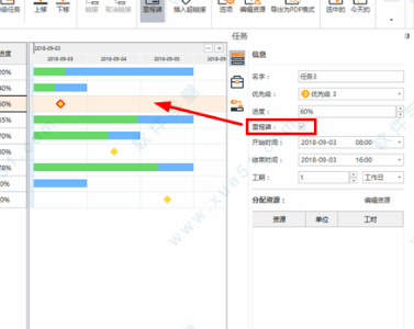 5、创建里程碑任务:某些项目计划是分阶段性的,每当这些阶段性的任务结束,都是一个大型的里程碑节点。点击右侧的任务面板,将“里程碑”勾选上,即可添加一个里程碑。