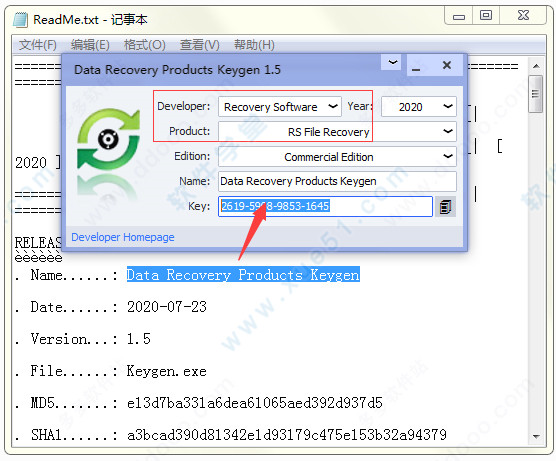 5、接下来对软件进行破解,打开注册机,再打开“ReadMe.txt”,选择公司recovery software,选择产品RS File Recovery,之后输入用户名后会自动生成注册码;