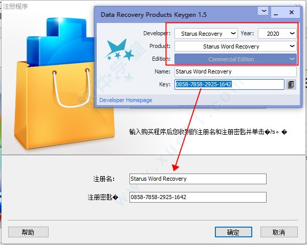 5、打开Keygen.exe,输入Recovery Software Products,点击Keygen.exe中右下角图标生存注册密钥,将注册名与注册密钥复制到指定位置,点击确定即可