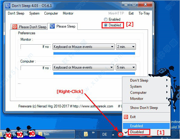 Dont Sleep是一款针对电脑系统管理的工具,比如我们有时候使用电脑有事要离开一会的时候,电脑可能就会自动休眠或者是给你重启,这样就会比较麻烦,特别是你要下载东西的时候,发生这种情况就会卡住下载不了,但是使用这款软件进行设置之后就不会再发生这种事情了,当我们不用电脑有事要去忙的时候也不会进入休眠状态或者是重启关机导致电脑内的任务没有继续进行下去,并且软件还能够对电脑内的各种软件进行相对应的设置操作,比如可以设定该款软件的使用时间是多久,到点了就可以自动把设定好的软件关闭,非常智能的帮助我们节省电脑的资源,而且软件还能够在没有鼠标键盘的时候操作关闭显示器或者是重启休眠等等功能,今天小编就给大家带来了