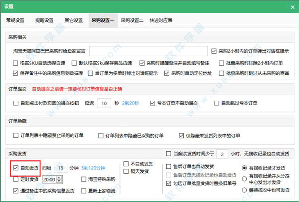 打开 【设置】-【采购设置一】,勾选【自动发货】