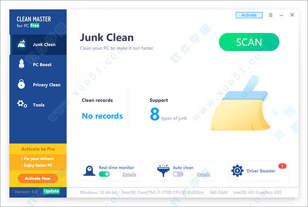 Clean Master是一款功能强大的系统垃圾清除软件,支持超多清洁工具,通过使用它们来提升电脑性能,使其更加快速流畅的运行。本软件采用增强的深层清洁技术,比以往更快、更稳定,操作更简单,更全面,即便是新手也可以毫无困难地使用其全部功能。软件能够帮助用户清理Windows系统中各种应用程序在使用过程中所造成的垃圾文件,包括使用痕迹,这样做的目的是在不删除应用程序的前提情况下防止盗用信息,保护您的信息安全和隐私。它除了清除系统垃圾外,还可以删除