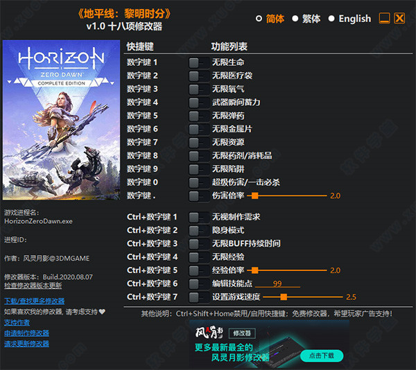 地平线零之曙光修改器风灵月影版来进行修改,比如无线生命,无限子弹等等,让游戏体验变的非常不错,喜欢的朋友们可以来下载试试!
