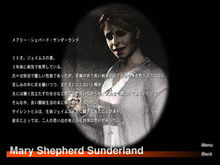 玛丽·谢泼德·桑德兰メアリー?シェパード?サンダーランド(Mary Shepherd Sunderland)25岁。詹姆斯的妻子。她在3年前因病辞世。她原本是个活泼、善良的人,但在她卧病在床期间,她开始诅咒自己。在痛苦中,她曾说她不想死,但同时她也渴望死亡。她告诉詹姆斯她既丑陋又没用,他应该抛弃她,但她也说过她希望他能陪在他身边直到她死。在经历了长期的痛苦和煎熬后,她逝去了。自从她和詹姆斯去了寂静岭观光开始,她一直对寂静岭有特殊的眷恋,认为那是个充满幸福回忆的地方。