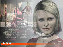玛利亚,マリア(Maria)25岁(?)。和詹姆斯的亡妻玛丽长得几乎完全一样的女子。但她的衣着风格,发型,性格和气场和玛丽完全不同。她很活泼乐观,但表现出某种感情上的依赖性。她也有情绪化的一面,出现过许多起落。她往往被异常的状况吓倒。她在和人说话时总是盯着对方的眼睛,听人说话时也是如此。她的兴趣是被詹姆斯偷看。詹姆斯正在赶往一个充满回忆的地方,于是她便开始跟随他。