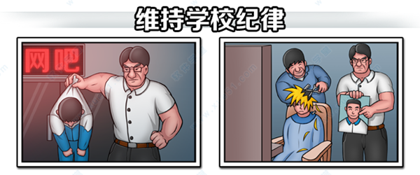 为了提升成绩,你必须用各种来阻止违规行为在学生之间扩散。为此你可以选择包括罚站,跑圈,写检查,甚至是记过和退学的处分方式去惩罚违反校规的学生。