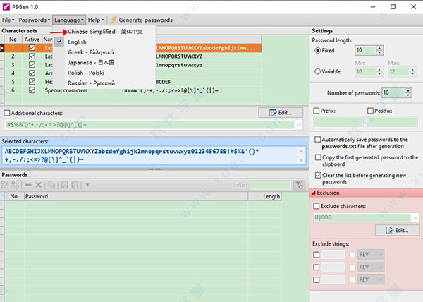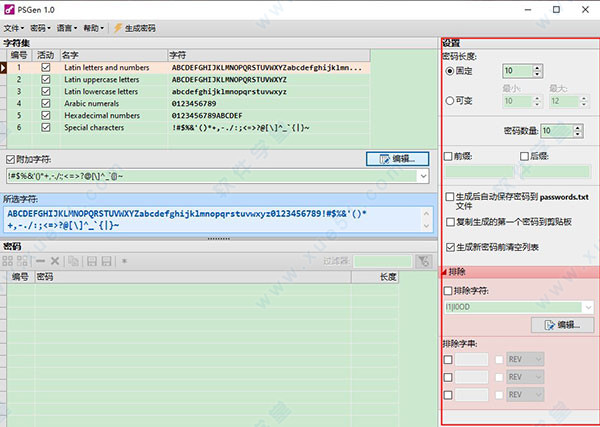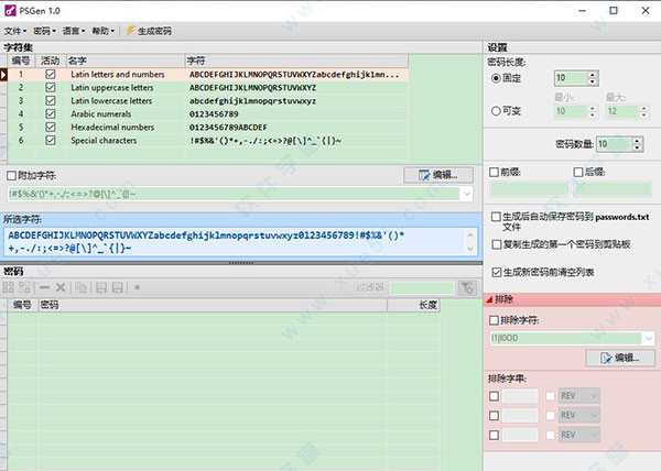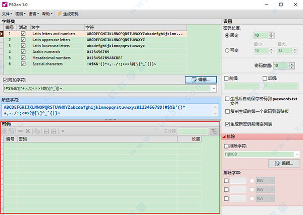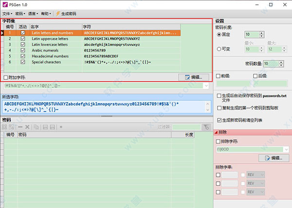 3、除了定义将构成生成的密码的字符集之外,用户还可以选择指定生成的密码不能包含的字符和字符串(在“排除”面板上)。