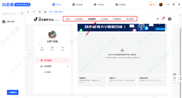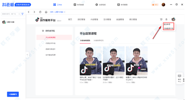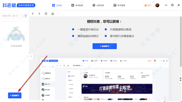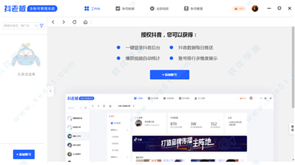 4、账号登录之后,在软件的右侧显示出抖音账号后台,用户可以直接开始管理该账号,要再添加一个账号管理则继续点击左下的添加按钮。