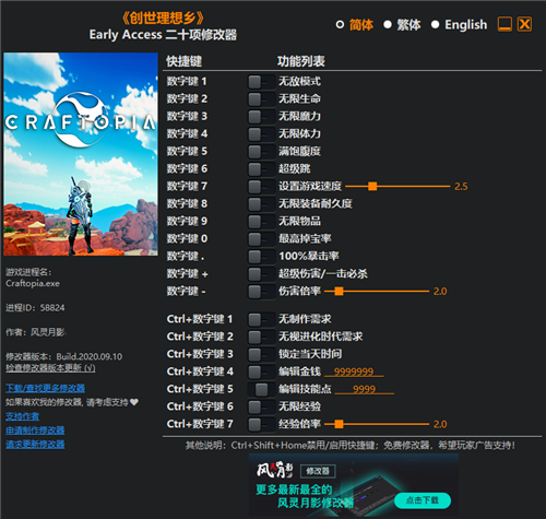 相比最近挺多玩家们应该都有在玩一款叫做创世理想乡的游戏吧,这款游戏也被称为缝合怪游戏,游戏内包含了非常多的玩法,各种各样经典的元素都有,你根本分辨不了这是一款什么具体类型的游戏,这也导致了游戏的复杂程度还是高的,新手玩家们可能会有些玩的不是很好,这个时候就需要到一款创世理想乡修改器了,它能够帮助玩家们在游戏中修改某些属性,比如无限生命,无限体力,无限攻击或者无限金钱等等,这些都能够很好的给玩家们带来更好的游戏体验,玩家们再也不用怕在游戏中玩着很缺金钱,或者是打不过怪物的情况,只需要使用它你就能变成游戏内顶尖高手,让那些邪恶的敌人好好感受下什么叫做残忍,最主要的是它的操作方法也是非常的简单,而且不占用什么内存,喜欢这款游戏的玩家们千万不要错过
