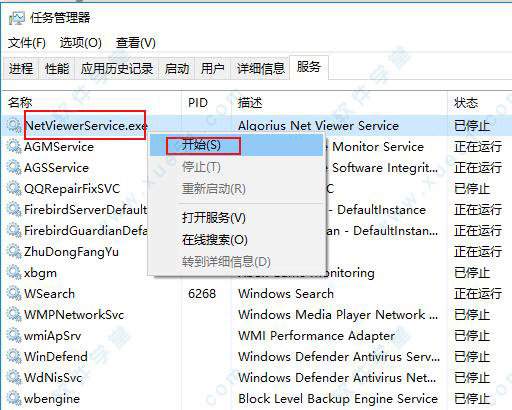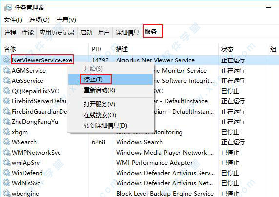 2、进入任务管理,选择NetViewer service,右键选择停止该服务