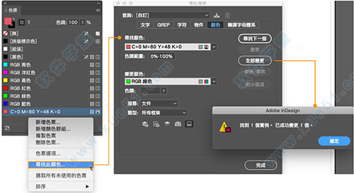 想要快速找出文件中使用的颜色吗?您可以快速在一或多个文件中搜寻一个颜色的所有实例、删除未使用的颜色或使用其他颜色取代。