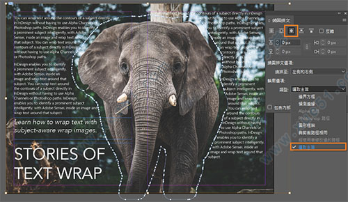 您可以在影像中智慧侦测主体,并将文字绕排在影像周围,这些都可直接在软件中完成。直接将文字绕排在主体的轮廓上,而无需使用Alpha 色版或Photoshop 路径。