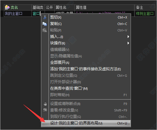 6、右键单击该类,在所弹出来的菜单中选择“设计我的主窗口的界面布局”;