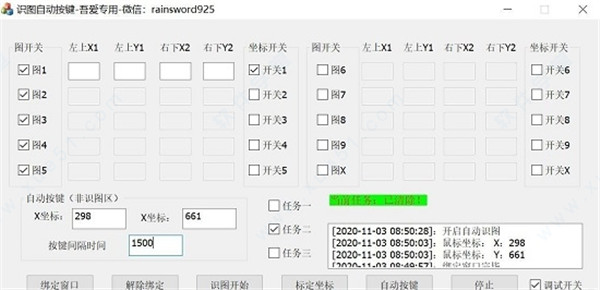四、自动按键功能,既可以自动获取,也可以手动输入1组坐标,按键时间间隔单位为ms。使用此功能时,应结束自动识图。