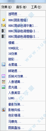 2、效果功能包括透明度、补光、减光、亮丽、清晰度、usm锐化、3d效果、清晰、超强清晰、鲜艳度、反转片、负片、lomo、晕影、梦幻影楼、色彩情调、马赛克、铅笔画。