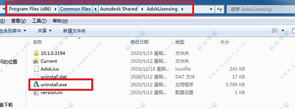 7、先打开路径【C:Program Files (x86)Common FilesAutodesk SharedAdskLicensing】,点击uninstall.exe把v10版本卸载