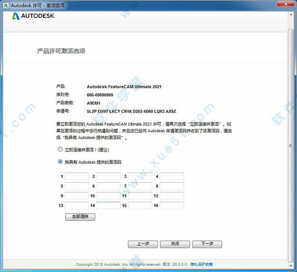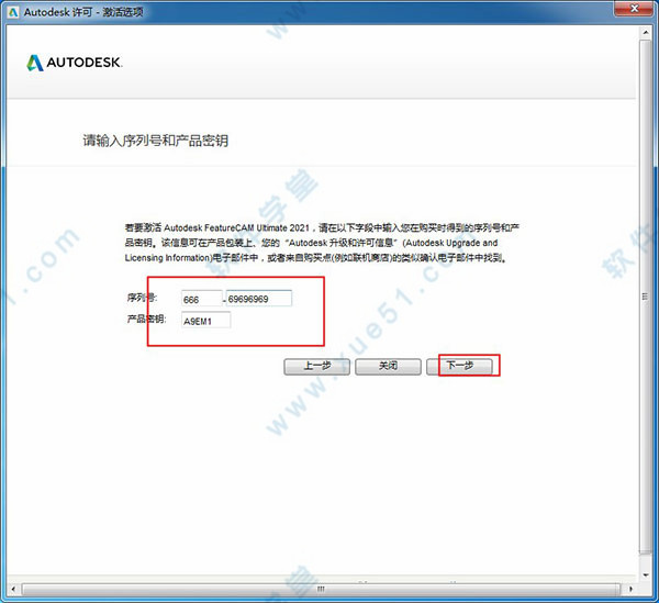12、输入FeatureCAM 2021序列号【666-69696969】和密钥【829M1】,点击下一步继续