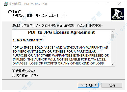 1、运行pdf-to-jpg-setup.exe安装程序,进入安装界面,点击我接受协议,同意软件许可协议