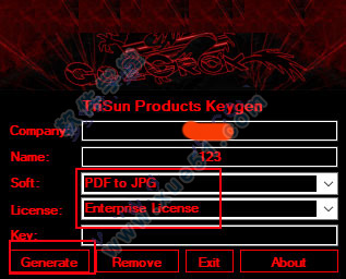 5、在此路径下双击打开TriSun Products Keygen By Go2Crck@TC.exe注册机,弹出界面,输入公司名称,选择pdf to jpg,选择enterprise license,点击generate得到key