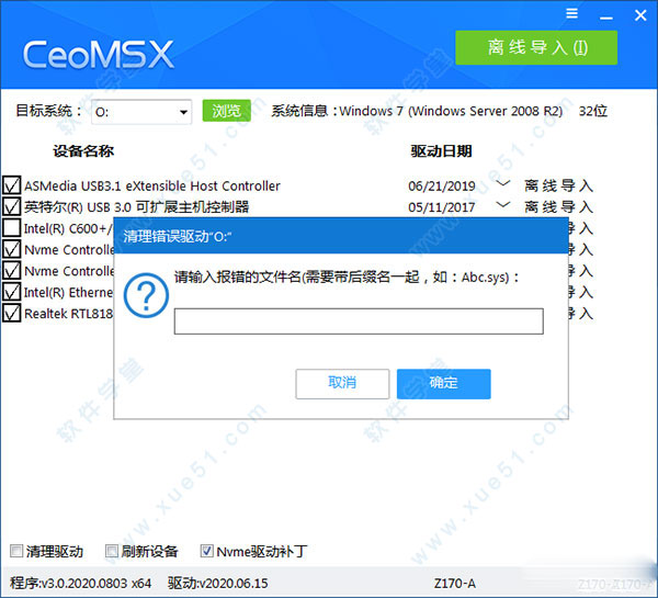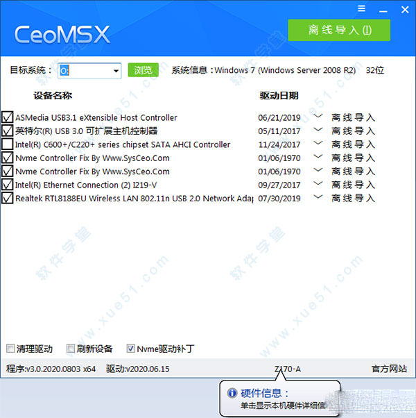 CeoMSX是一款非常好用的驱动离线导入工具,支持离线导入磁盘控制器驱动及XHCI驱动,可用于PE环境中导入C盘系统所需的驱动程序。它可以帮助用户解决GHO系统内本身不含驱动导致装系统的时候蓝屏问题,能够帮助您给正常系统导入磁盘控制器驱动从而顺利安装系统。除此之外,软件还有别的用处,比如可以生成一份驱动安装日志,里面有设备 (实例ID/硬件ID/兼容ID) 信息详细列表,还有电脑操作系统信息之类的数据,一切尽在您的掌握之中。这里为大家带来了