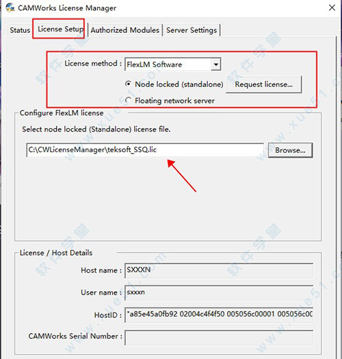 CAMWorks License Manager,切换至License Setup,License method选择FlexLM Software,浏览指定CWLicenseManager文件夹下的teksoft_SSQ.lic许可证文件