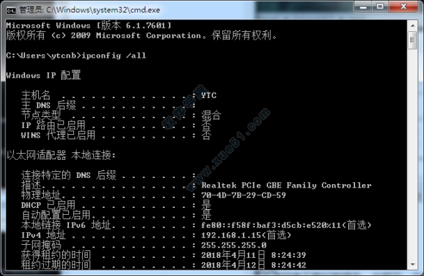 4、选择-开始-输入cmd-弹出命令提示符,输入“ipconfig /all”回车