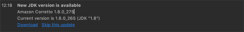 从v2020.3开始,可以从任何有可用更新的弹出窗口中迁移到最新的JDK。您可以选择是要安装还是跳过它。