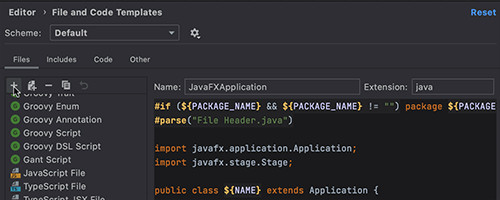 在首选项/设置| 编辑器 文件和代码模板,现在可以添加创建多个文件的模板。首先,单击+创建一个新模板。要向其中添加另一个文件,请单击+旁边的创建子模板文件图标。在“ 文件名” 字段中,您可以使用“描述”部分中列出的变量输入模式以生成文件名和路径。
