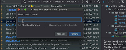 创建新分支时,IDE会自动更正分支名称中不可接受的符号。我们对当前分支的上下文菜单进行了重新设计,以显示相关操作。对于远程分支机构,我们已经改名为合并到当前和当前衍合到选定的行动作为拉进当前的使用合并和使用衍合拉入电流,分别。
