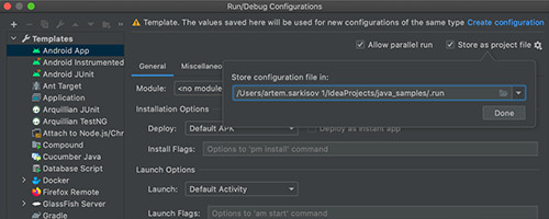 在IntelliJ IDEA 2020.3中,您可以将运行配置模板存储为XML文件,然后通过Git或其他VCS与队友共享。要启用这些功能,请转到“编辑配置...”,展开“模板”节点,选择一个配置模板,选择“ 另存为项目文件”复选框,然后定义用于存储此配置模板的路径。