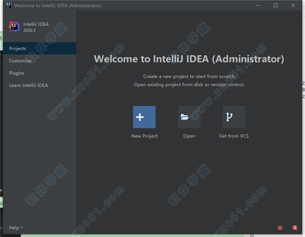 2、当然新功能也不仅仅就如此一点点,在该版本中为用户重新设计打造了新的欢迎屏幕界面,与2020.2版本相比,新版内经将初始向导替换为项目管理项目、自定义设置了IDE接口、插件的插件安装、学习了解这四个标签选项啦。