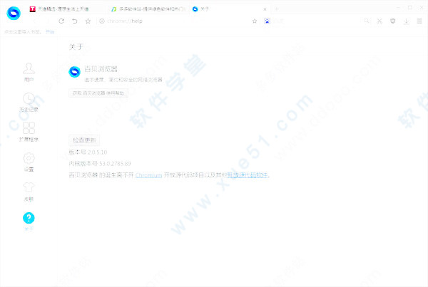 3、查看百贝浏览器的关于,我们可以看到是基于chrome浏览器内核而开发的,稳定安全快速。