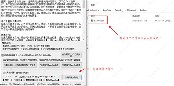 3、安装完成之后点击打开插件文件夹,看到那个.xll文件即表示安装成功,可以在Excel里面使用了。