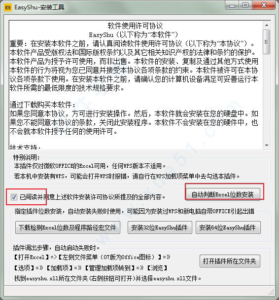 3、再运行"02EasyShu插件安装包2.863.exe"程序,点击自动判断Excel位数安装;