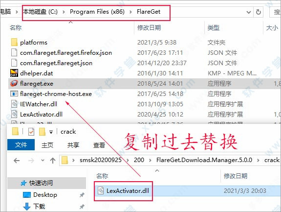 10、接下来对软件进行破解,将crack破解文件夹下的所有文件复制到软件安装目录下替换;软件默认目录为【C:\Program Files (x86)\FlareGet】。