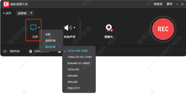 3、点击“全屏”可选择录制区域,包括全屏、固定区域等,自由进行选择。