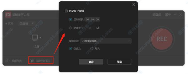 7、点击“自动停止”可选择自动停止录制,设置录制时长以及文件大小。