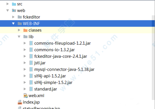 2、然后将项目所需的5个库文件复制到项目的web-inf下的lib目录下。库文件名及位置如下图
