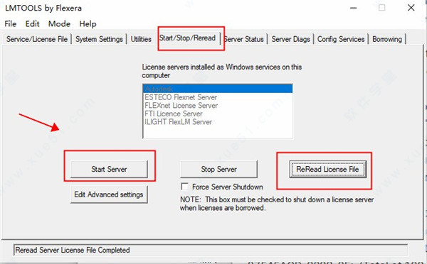 16、点击start/stop/read选项,点击 'rereadlicense file',再点击'start server'启动服务。
