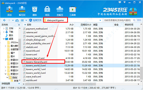 4、在好压窗口里双击game文件夹→双击towers_hierarchy.xml,打开方式设置成记事本。