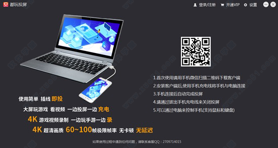 都玩投屏是一款手机投屏到电脑的投屏工具。很多朋友们在手机上看电影和电视剧时,都会感觉屏幕太小了,看着不尽兴。这款投屏的工具就可以很好地解决这个问题。它支持有线投屏和无线投屏的两种方式,通过数据线连接手机和电脑,可以把手机屏幕同步到电脑桌面,还可以通过蓝牙的方式进行无线连接,在一边为手机充电的同时,还可以在电脑上玩游戏、看视频,甚至是直播。软件使用起来非常简单,而且传输的画质也是4K超高清画质,60-100帧的极限帧率,内容的播放流畅,不会有延迟和卡顿,在电脑上也可以无压力地运行手机游戏。除此之外,软件还支持视频的一键录制和保存,帮你记录精彩的瞬间,广范适用于智能电视、投影仪、车载系统以及直播等多种场景。这款