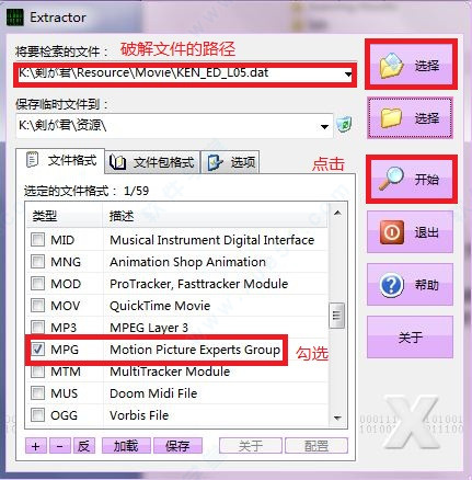“文件格式”一栏是选择你抽取的封包中文件要转成的最终格式,R社的OP和ED可以转成MPG格式,所以我们这里只勾选这个选项。
