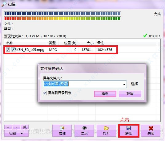 3、等待扫描完成,就会看到一个MPG格式的视频文件。勾选,再点击右下角的“解压”按钮,确认你想存放的路径,等待解压完成,视频就导出来了。