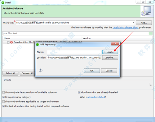 2、点击add>local,将解压文件中的juno文件导入,点击ok