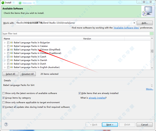 3、在name里选择“Babel Language Packs inChinese(Simplified)”简体中文选择项,点击next